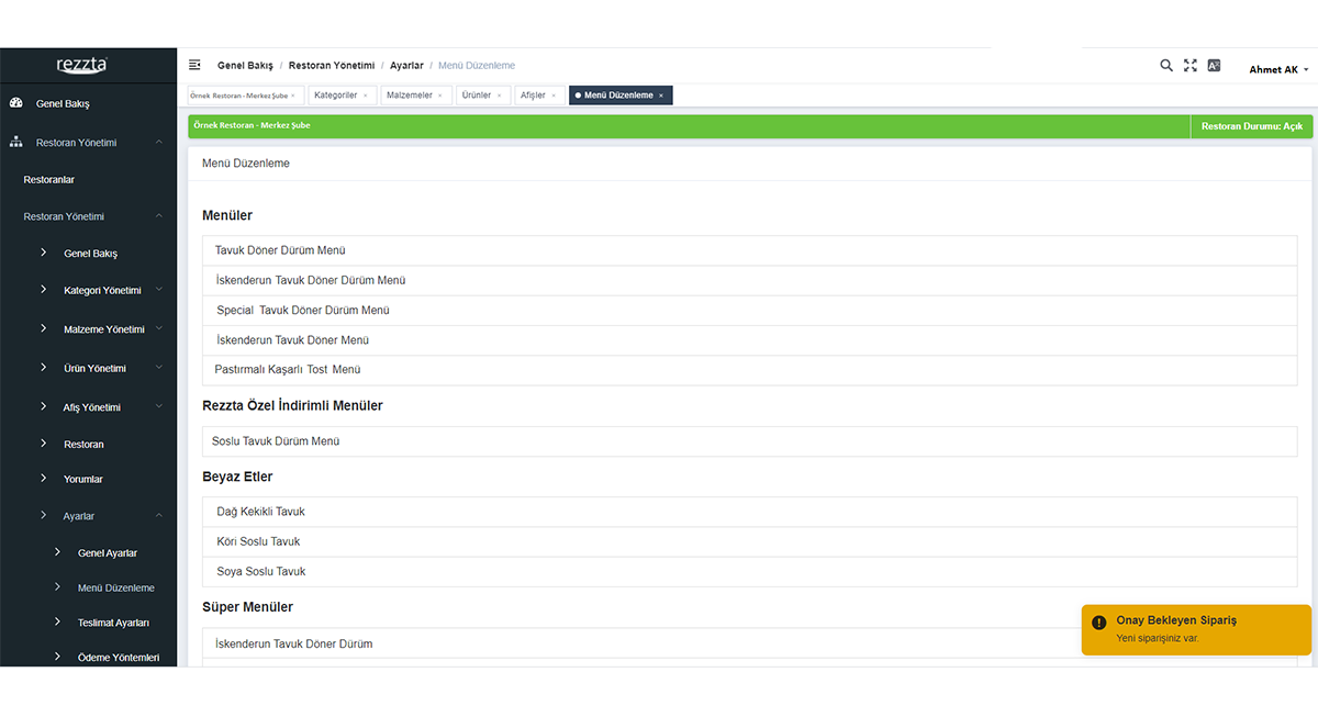 Sipariş, üyelik, adres tanımları, sipariş takibi, restoran yönetim bölümü, şube ve konum tanımları, Wolvox Restoran entegrasyonu